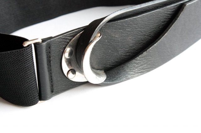 Czarny pasek wykonany z połączenia elastycznej gumy i (prawdopodobnie) skóry naturalnej. Ciekawe "zapięcie" i regulowana długość.
