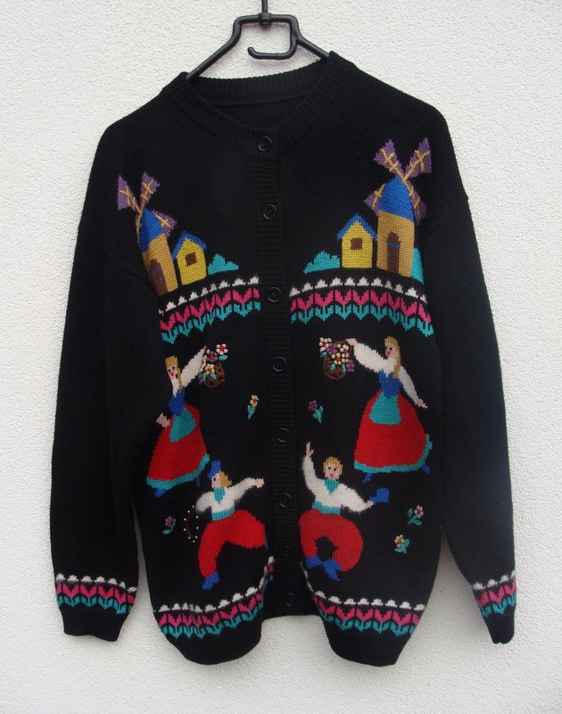 Zjawiskowy unikatowy dłuższy sweter typu kardigan z czarnej włóczki w kolorowe etniczne wzory. Zapinany na całej długości na guziki.