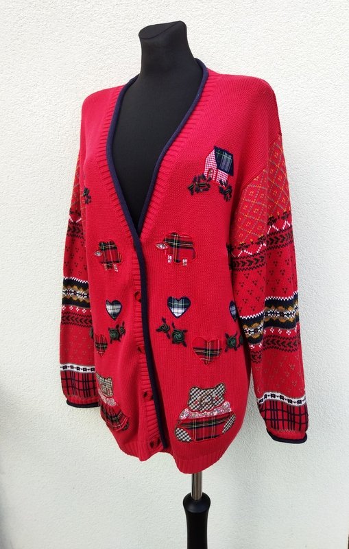 Unikatowy sweter z bawełniano -akrylowej włóczki w czerwonym kolorze z przodem zdobionym aplikacjami z wzorzystych tkanin i wypukłym haftem kwiatowym. Rękawy z wzorkami w kolorach odcieni zieleni, zgaszonej żółci, i czerni. Wykończony ściągaczami i odwijaną pliską. Zapinany na guziki.