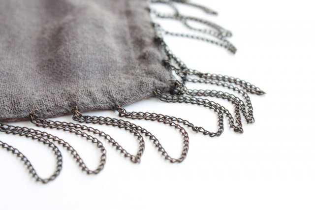 Szary szal o ciekawym, asymetrycznym wykończeniu brzegów łańcuszkami.