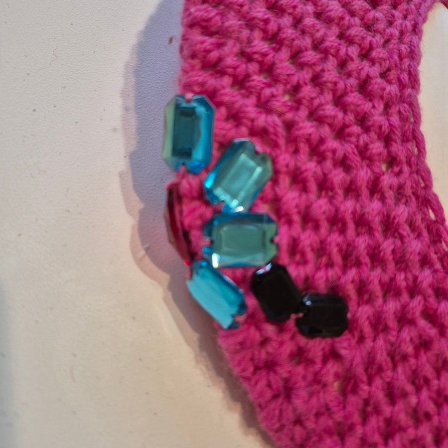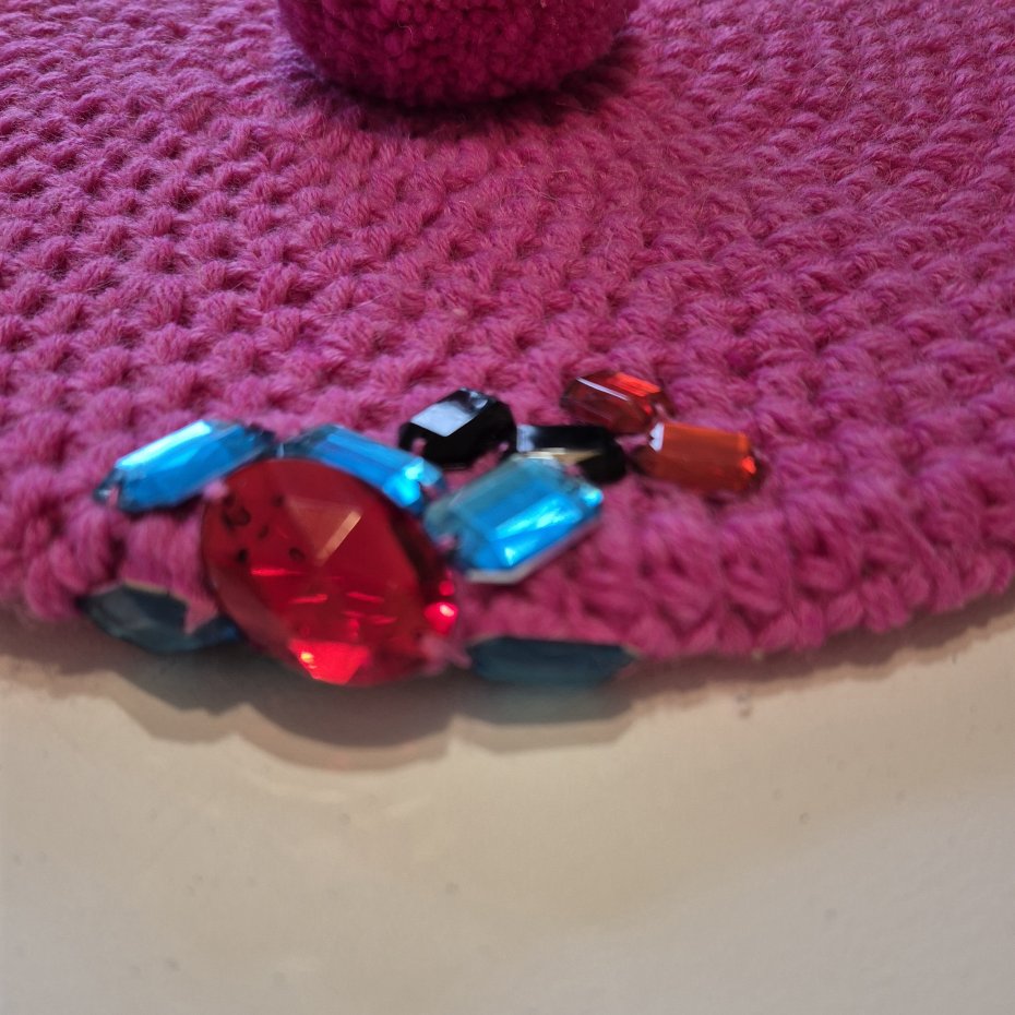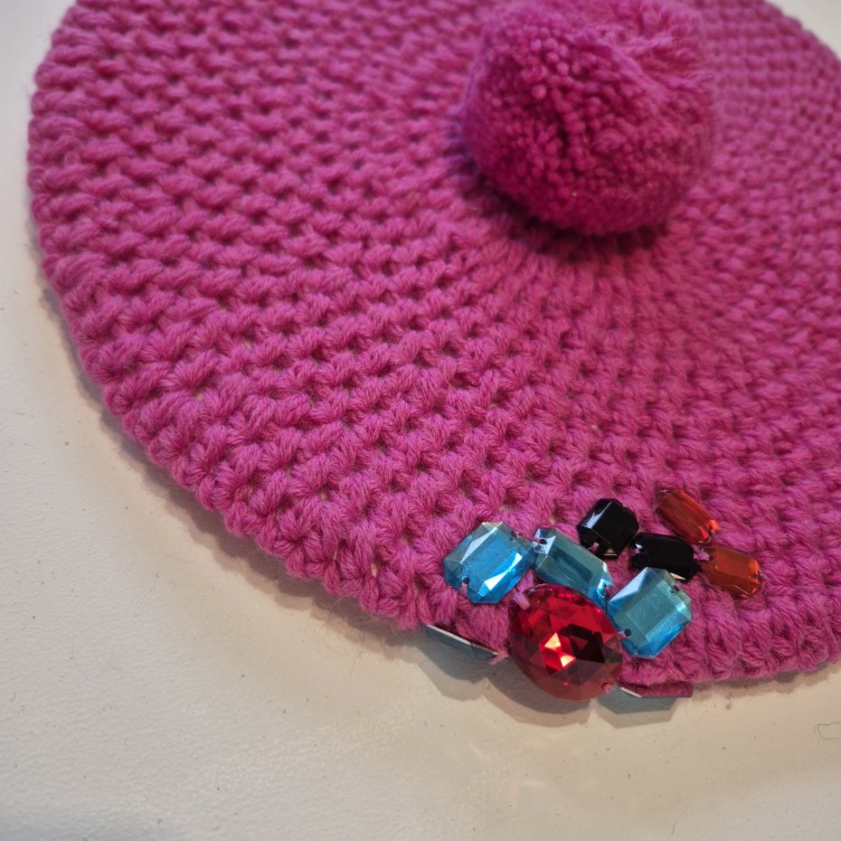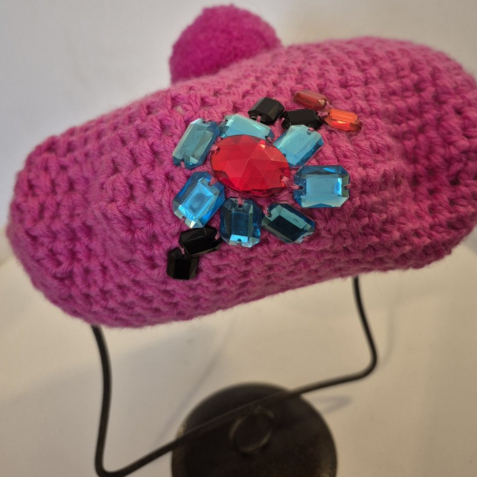 Beret zrobiony na szydełku z włóczki w różowym kolorze. Ozdobiony dekoracją z kolorowych kamieni i pomponem.