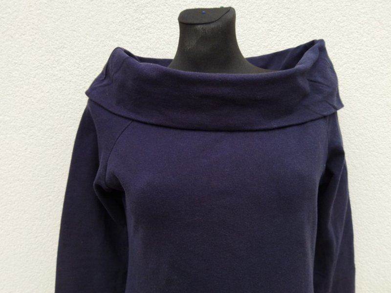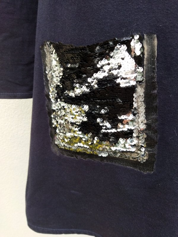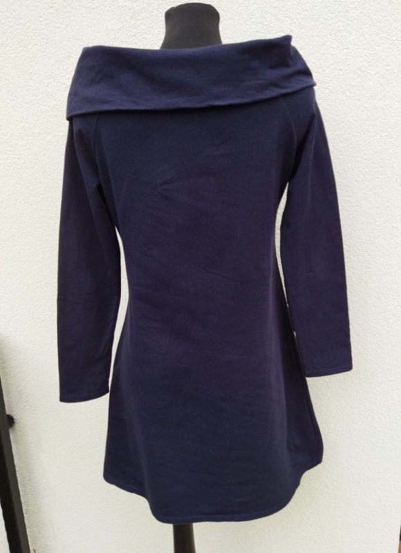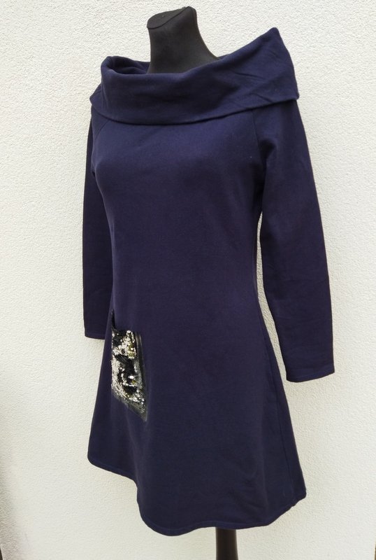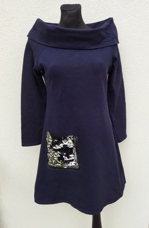 Sukienka z bawełnianej dresowej tkaniny dzianinowej w ciemnogranatowym kolorze z aplikacją z ruchomych cekinów. Z dekoltem z dużym luźnym golfem, rękawy raglanowe