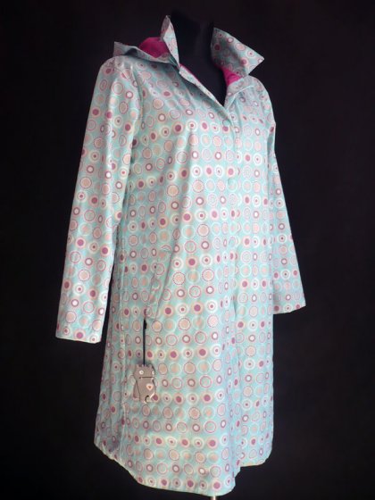 Duński pastelowy-optymistyczny płaszczyk przeciwdeszczowy.Uszyty z tworzywa.Wew.różowa podszewka z wiskozy.Zapinana na zatrzaski.Dwie kieszenie z przodu.Kaptur.Do kieszonki doczepiony potworzasty breloczek.