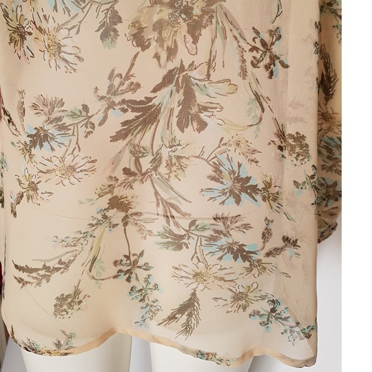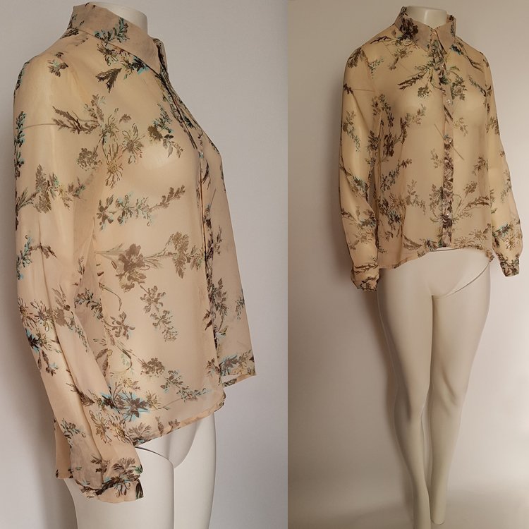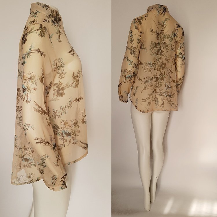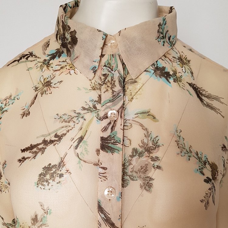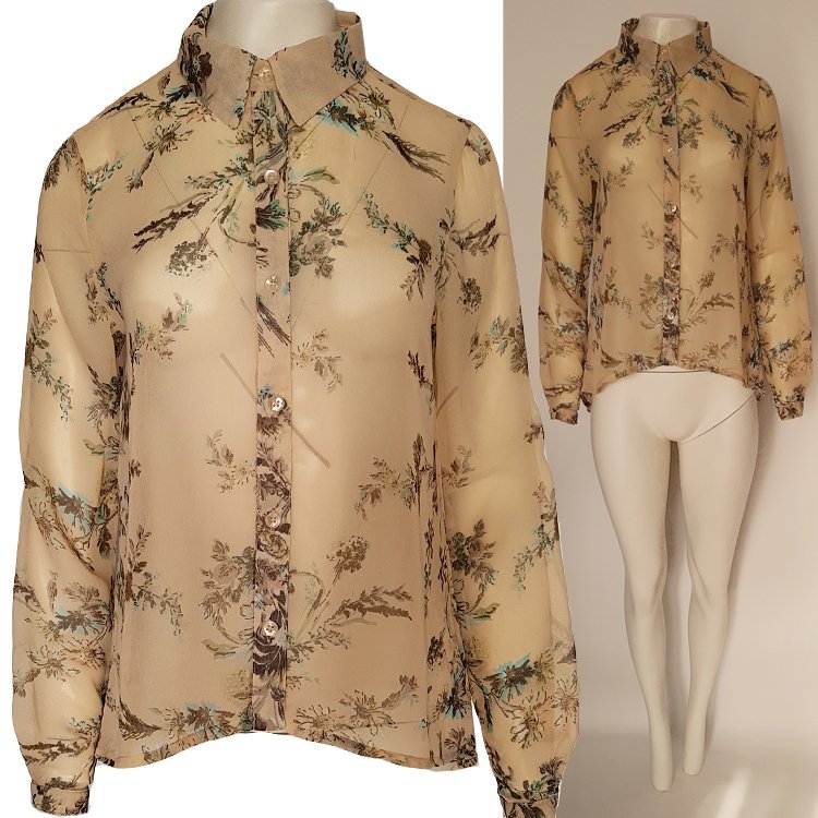 Asymetryczna, cielista koszula z szyfonu we wzory kwiatowe. Koszula zapinana z przodu na guziki z masy perłowej, wykończona kołnierzem, tył zaokrąglony nieco dłuższy. Rękawy długie zakończone wąskim mankietem. Zalecana halka lub cielisty top pod spód. Przepiękny, subtelny, ożywczy dodatek pod marynarkę, sweter etc.