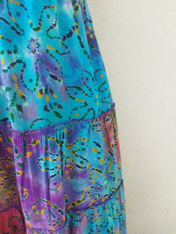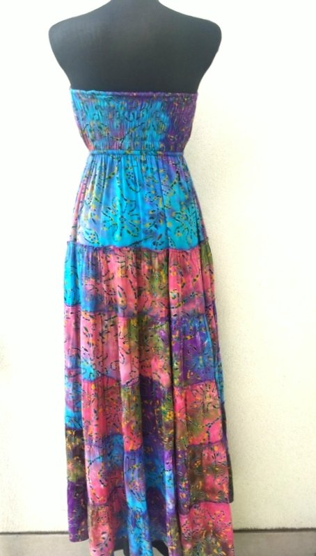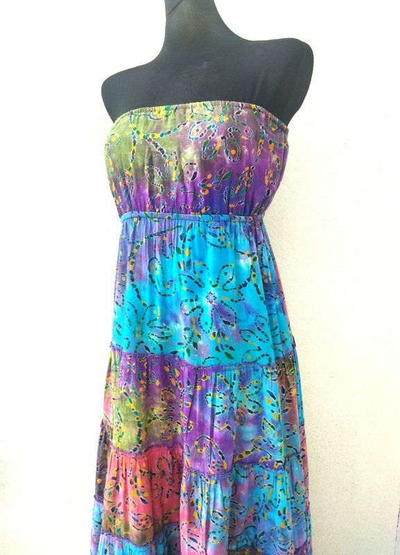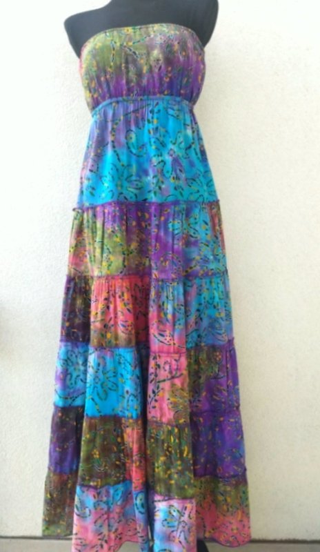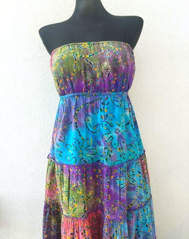 Sukienka maxi z cienkiej przewiewnej tkaniny bawełnianej w kwiatowe wzory w kolorach lazuru, antycznego różu, odcieni zieleni i żółci. Góra na ściągaczu z gumek z tyłu z wciągniętą gumka u góry i w pasie, dół z 6 naszywanych na siebie falban. Wciągana bez zamka. Na cieniukiej bawełnianej podszewce do kolan.
