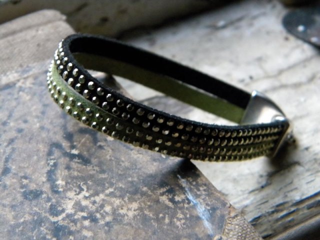 bransoletka z tekstylnych taśm przypominających zamsz pokryta błyszczacymi ćwieczkami. zapięcie metalowe. długość bransoletki 19,5cm.