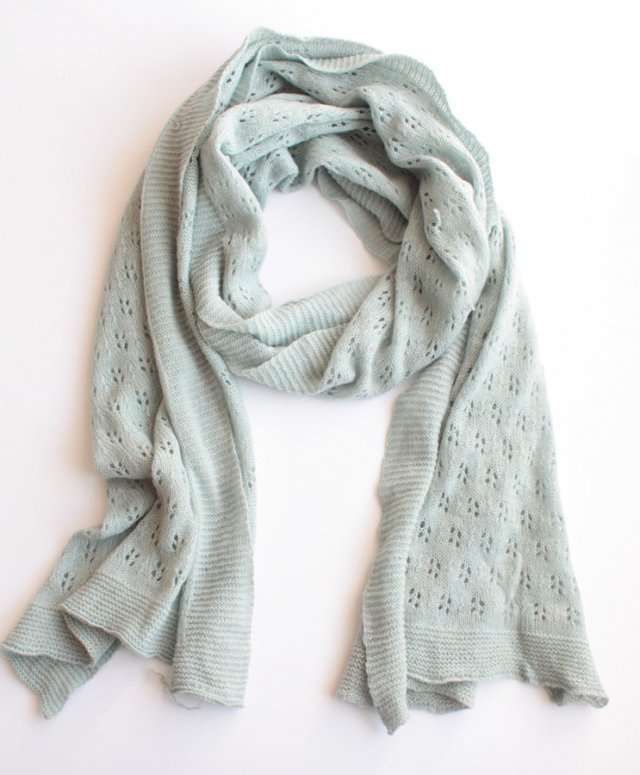 Miękki, ażurowy szal w ciekawym pastelowym odcieniu pomiędzy błękitem a jasną zielenią. Materiał to prawdopodobnie akryl.
