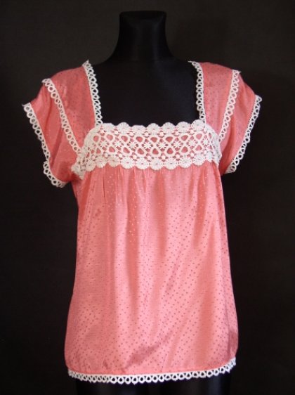 Koszulka nocna firmy .Rozmiar 14,nasz 40-42.Materiał wiskoza.Przód odcięty,lekko zmarszczony,ozdobiony naszytą bawełnianą koronka.Dekolt i obszycie dekoltu obszyte taśmą bawełnianą.Po bokach wszyte paski do wiązania z tyłu.Stan bardzo dobry-.Długość 64 cm.