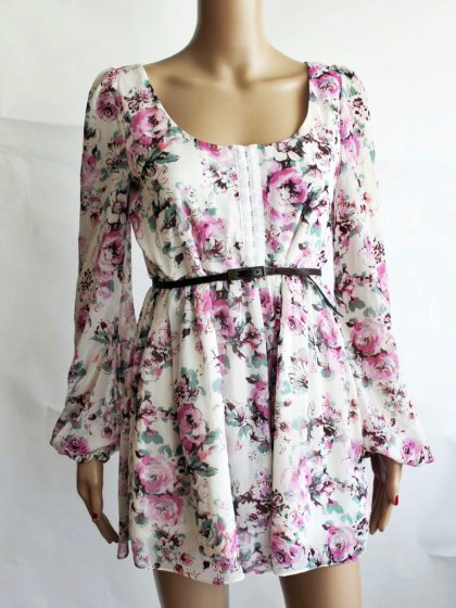 Sukienka tunika marki Savida w rozmiarze 38. Sukienka z bardzo ładnym wzorem kwiatowym. Odcinana z przodu zapinana na rząd haftek Krój lekko kloszowany. Na podbiciu. Stan bardzo dobry - jedna zaciągnięta nitka na materiale