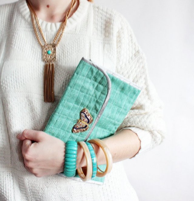 Niezwykła torebka ozdobiona motylkiem z koralików. Zapinana na rzep, na podszewce. Wykonana z lnu, pikowana. Pasek z aksamitki.