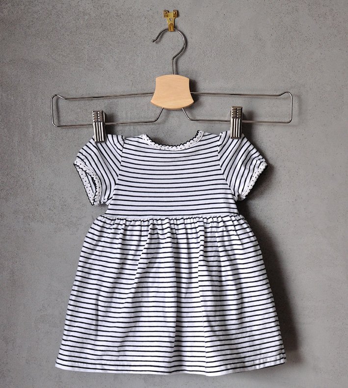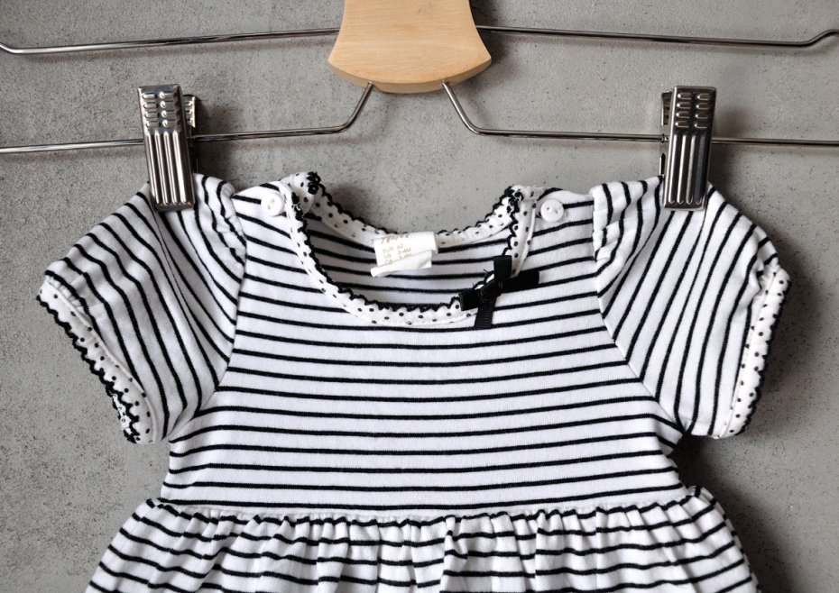 Sukienka uszyta z organicznej białej bawełny z elastanem: część materiału jest w czarne paski, reszta - w czarne kropki.