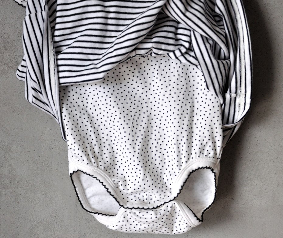 Pod spódniczką wszyty dół od śpioszków, zapinany na zatrzaski - w kropki.