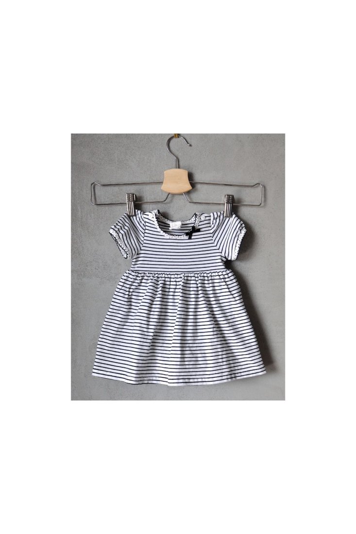 Sukienka uszyta z organicznej białej bawełny z elastanem: część materiału jest w czarne paski, reszta - w czarne kropki.
