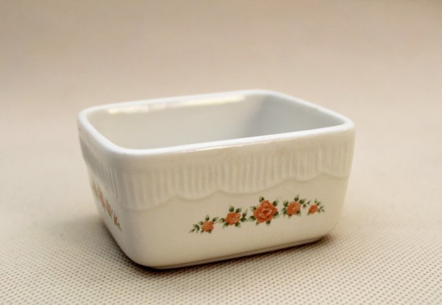 Biała porcelana zdobiona kolorowymi kwiatkami.