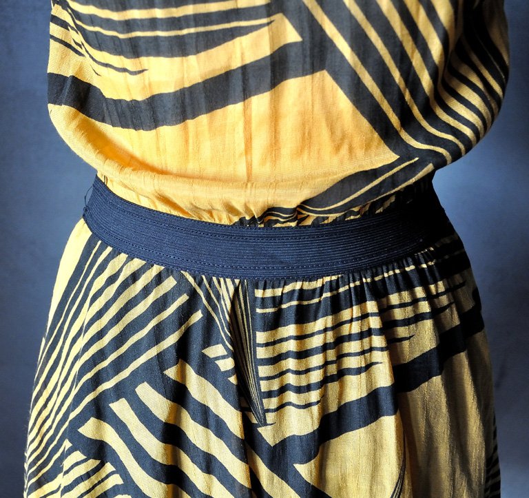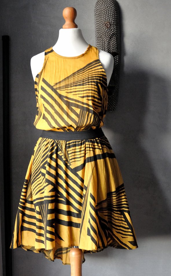 Uszyta z ciekawej tkaniny w musztardowo - czarne wzory geometryczne.
