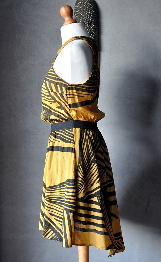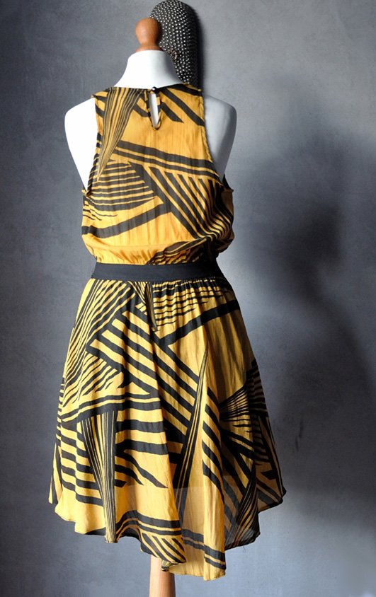 Uszyta z ciekawej tkaniny w musztardowo - czarne wzory geometryczne.