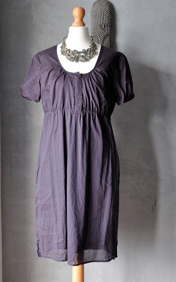 Fason empire: odcinana pod biustem, ze sporym okrągłym dekoltem i krótkim rękawem. Na biuście ukryte pod listwą materiału zapięcie (na guziczki).
