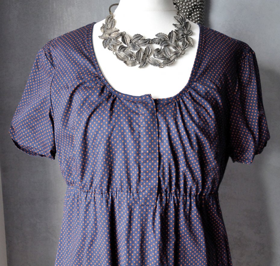 Fason empire: odcinana pod biustem, ze sporym okrągłym dekoltem i krótkim rękawem. Na biuście ukryte pod listwą materiału zapięcie (na guziczki).