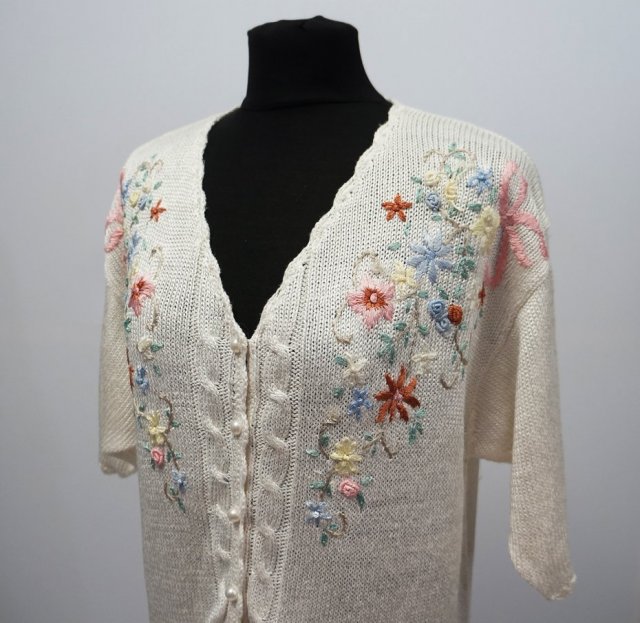 Prześliczny sweterek ozdobiony uroczymi haftami (kwiatuszki oraz kokardki)