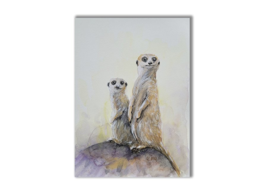 Ręcznie malowany obraz przedstawiający dwie stojące surykatki na skale. Obraz wykonany techniką akwarelową, na białym, wysokogatunkowym 300g papierze (15x 20cm).