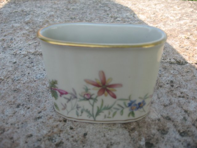 Porcelanowy pojemniczek w kolorze ecru zdobiony delikatnymi kwiatuszkami i złoceniem na rancie, sygnowany. Z przeznaczenia na stół do wykałaczek albo jako przedmiot łazienkowy służyć może np. na patyczki. Wymiary - 6 x 7 x 3 cm. Stan zachowania bardzo dobry.