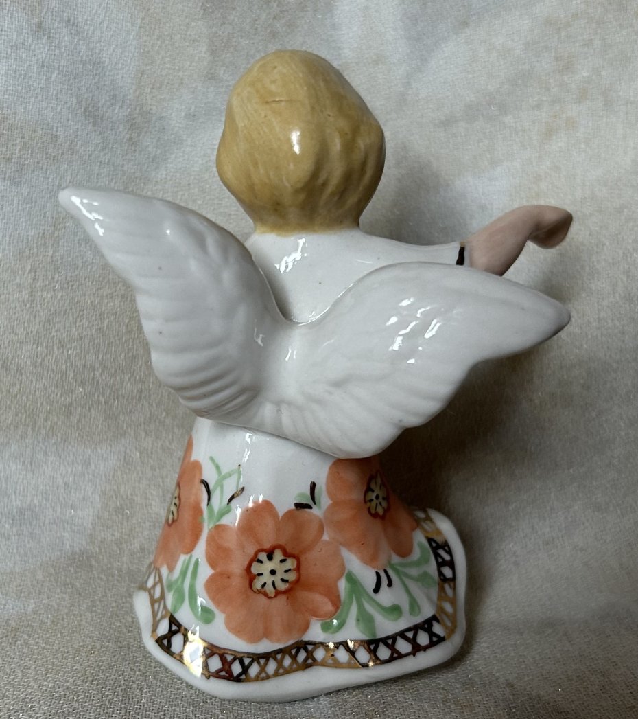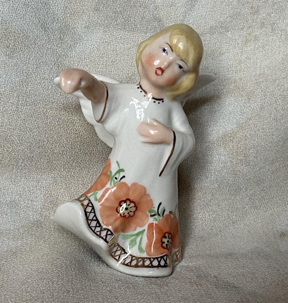 ART CEROM PROD.Com SRL. Sygnowana figurka porcelanowa . Urocza , w dawnym stylu . Pastelowe barwy i złoto . Wykończenie satynowo błyszczące Szerokość skrzydeł 7 szerokość całkowita około 7 podstawa 5,5 x 4,5 wysokość 9,5 cm Stan zachowania bardzo dobry - na prawej dłoni znajduje się dziurka jakby coś anioł miał trzymać przyklejone do dłoni … co zapewne minusem choć mało widocznym jest . . Ciekawa rzecz do kolekcji i dekoracji .