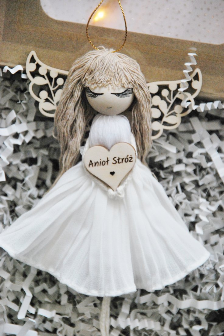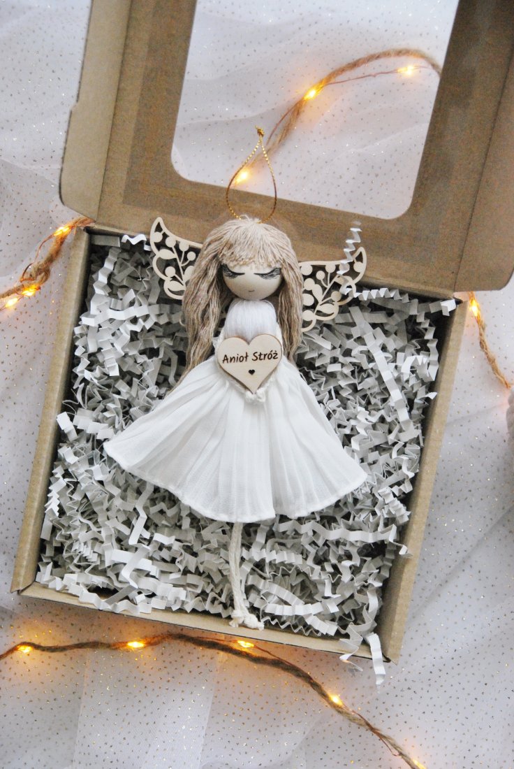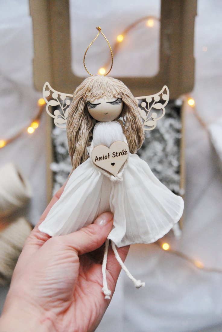 Delikatne włosy z naturalnych sznurków, subtelne drewniane skrzydła o misternym wzorze i lekka sukienka z plisami nadają mu niezwykłego uroku. W sercu aniołka znajduje się drewniane serduszko z napisem "Anioł Stróż" – symbol opieki, miłości i dobrych myśli.