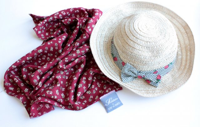 Pleciony, płytki kapelusz ozdobiony kwiatową kokardą.
