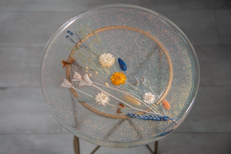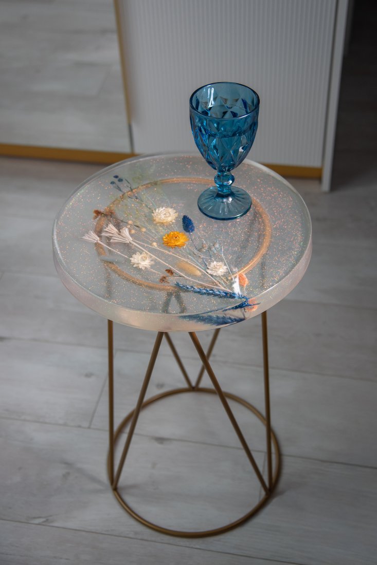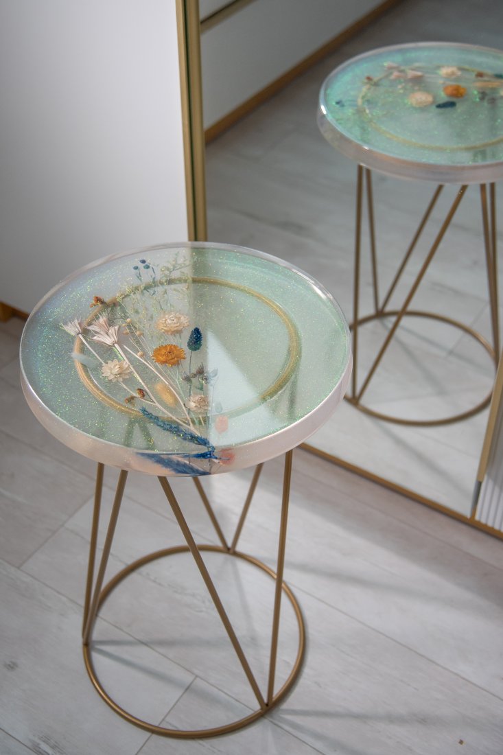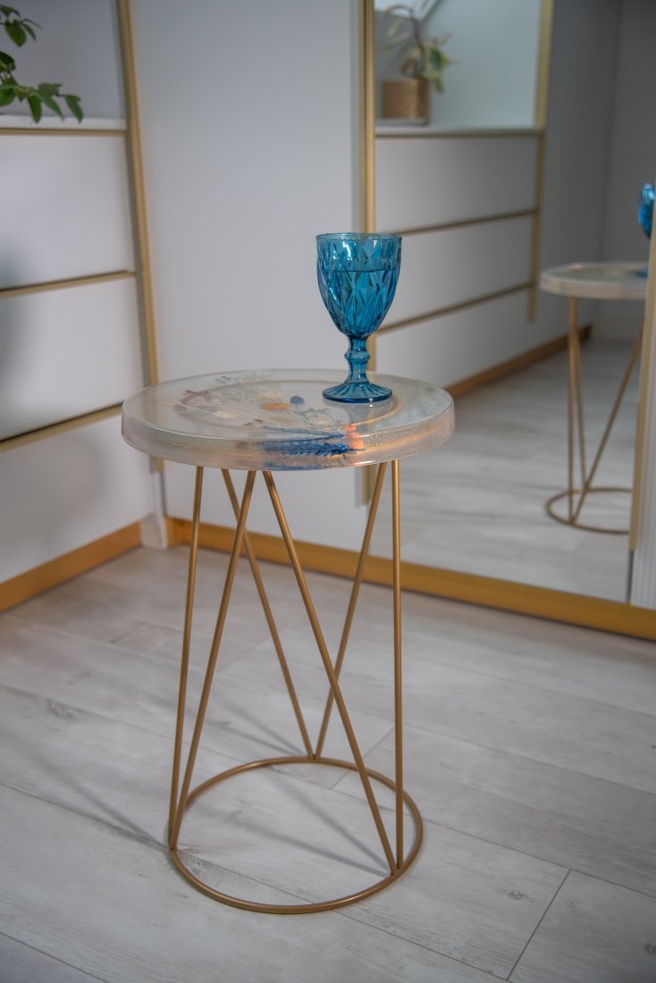 Stoliczek dzięki niewielkim (średnica blatu 35cm, grubość blatu 3cm, wysokość 53cm) rozmiarom może być stoliczkiem kawowym, pięknym kwietnikiem lub stoliczkiem nocnym. Blat został wykonany ręcznie z żywicy epoksydowej (zabezpieczony lakierem), w którym zostały zatopione suszone kwiaty. Uniwersalności dodają metalowe nogi z delikatnego złota a zatopione w blacie opalizujące na różne kolory drobinki, pięknie odbijając światło dodają elegancji. Na żywo stoliczek prezentuje się jeszcze piękniej, szczególnie mieniąc się w słońcu lub sztucznym świetle.
