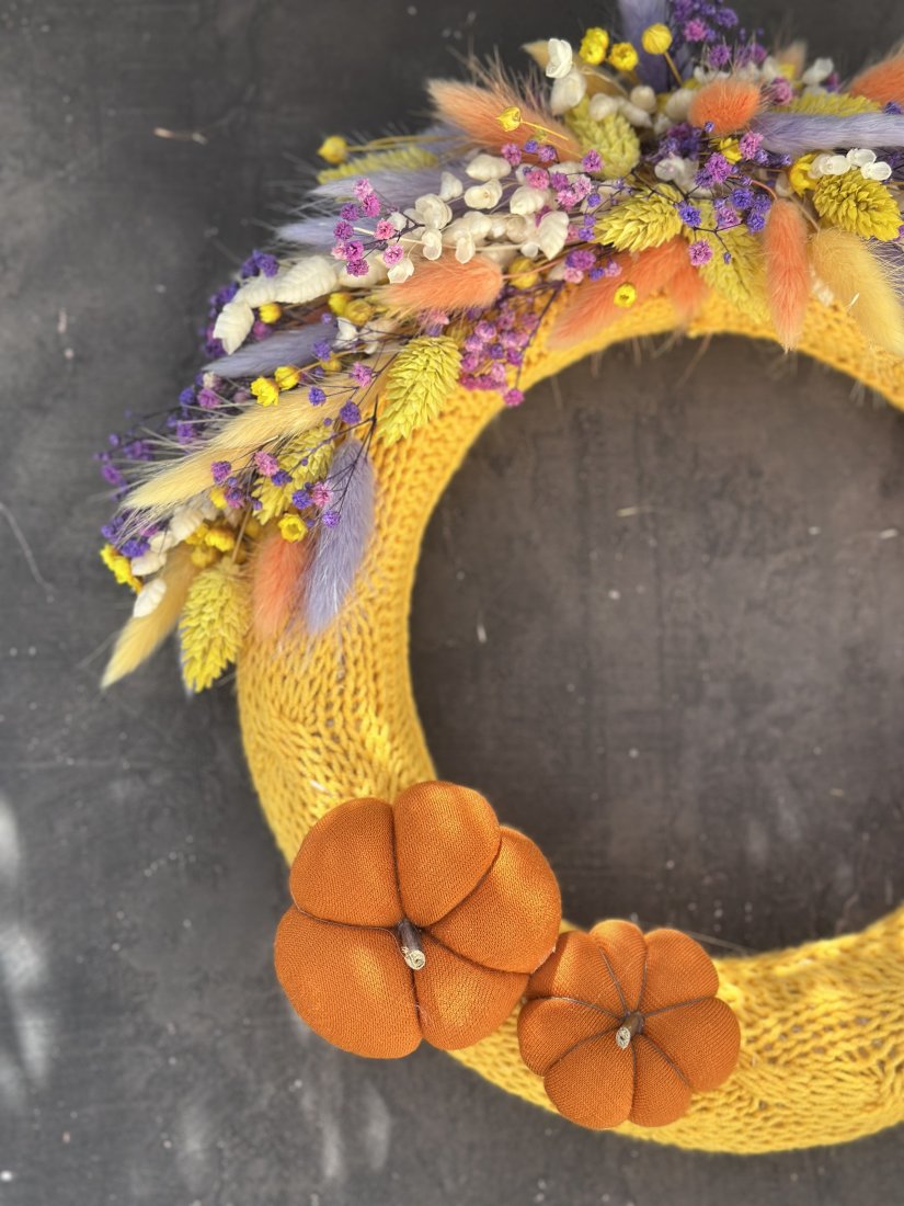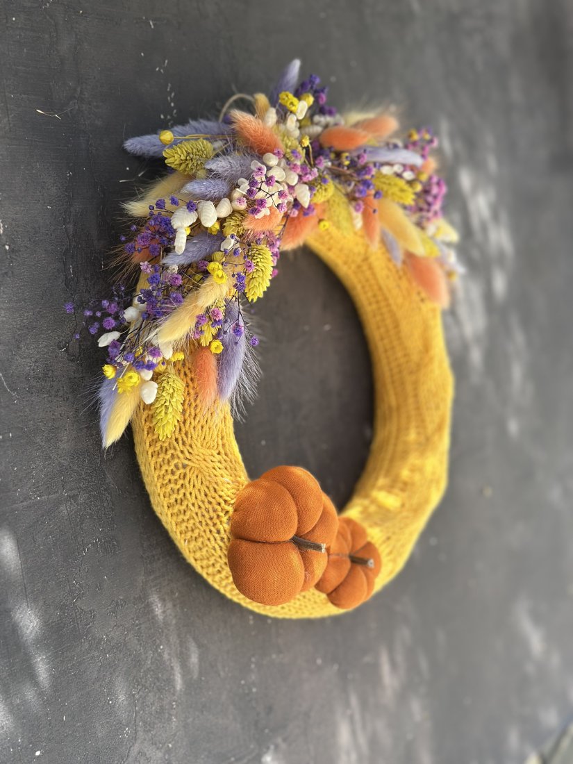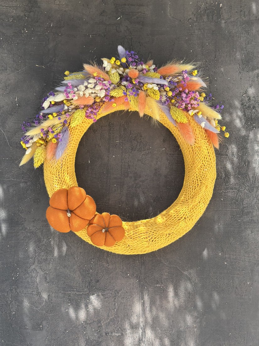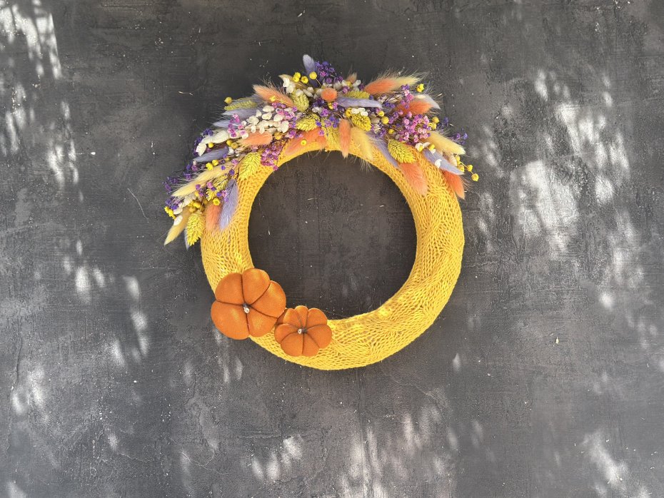 Wianek w ręcznie robionym sweterku z włóczki, ozdobiony naturalnymi, suszonymi kwiatami.