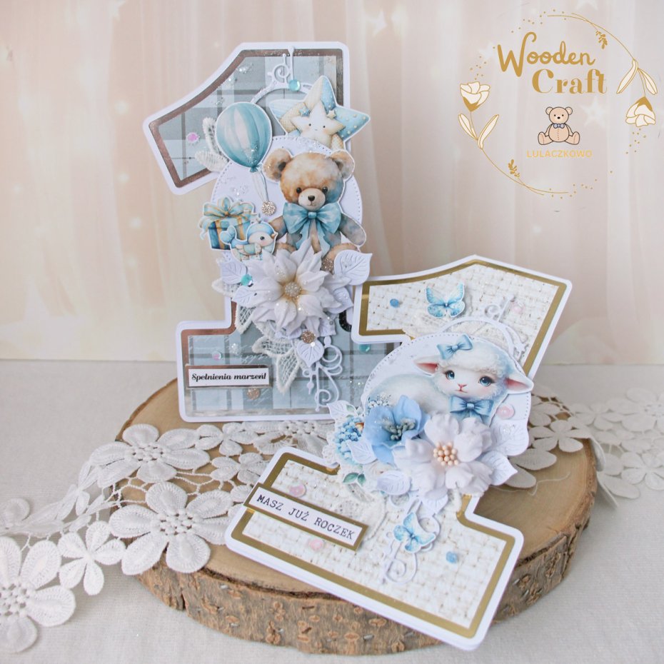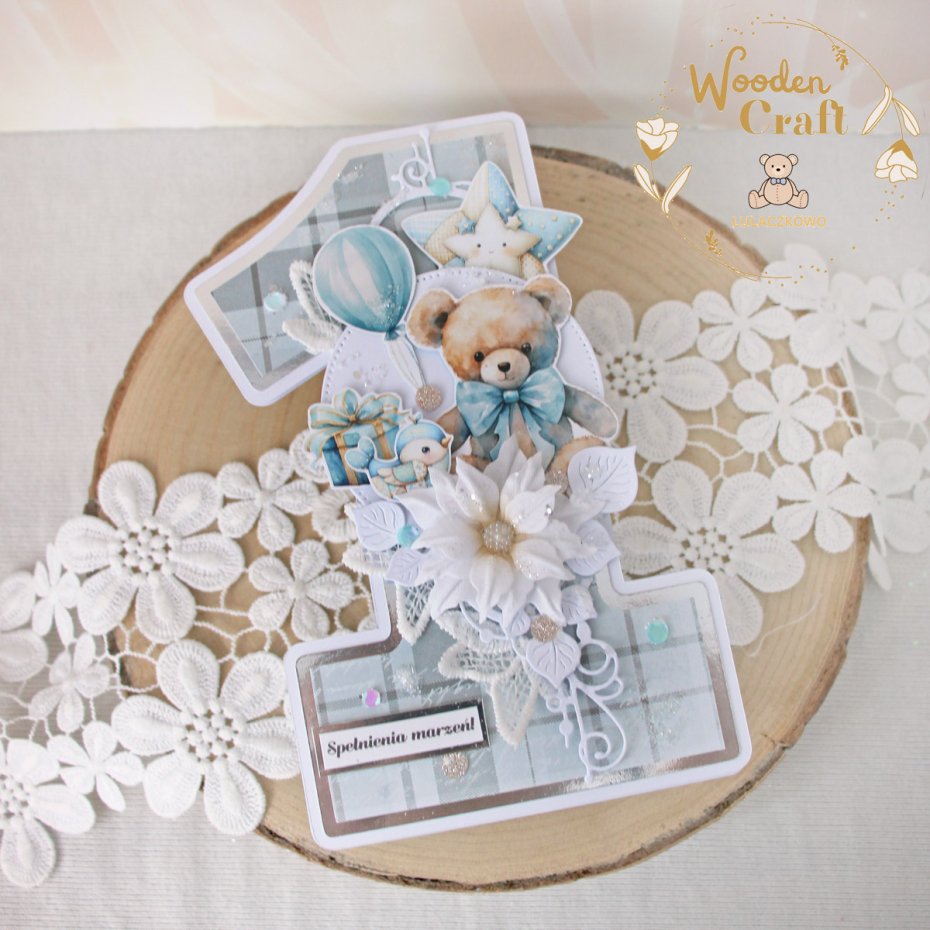 Urocza i nietuzinkowa, dziecięca kartka na roczek, w kształcie cyferki jedynki, wykonana z mixu kolekcji papierów dziecięcych, utrzymana w odcieniach szaroniebieskiego i bieli z dodatkiem błyszczących, srebrnych akcentów. Kartka wykonana ręcznie z dbałością o każdy szczegół. Na środku znajduje się grafika uroczego pluszowego misia z balonikiem i prezentem, ozdobiona kompozycją kwiatową z ręcznie wykonanym kwiatuszkiem, dodatkowo zdobiona cekinami i koronką, połyskującymi drobinkami, a także napisem "Spełnienia marzeń" (na życzenie mogę dodać również imię dziecka, lub całkowicie zmienić napis na inny).