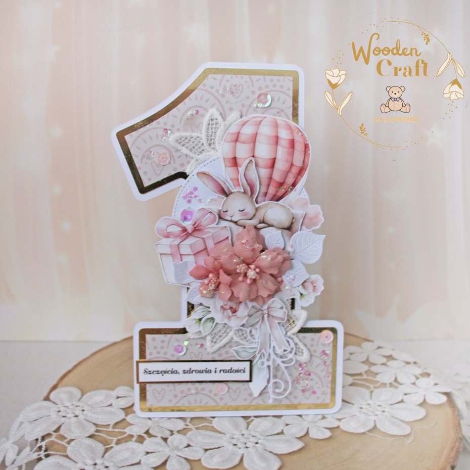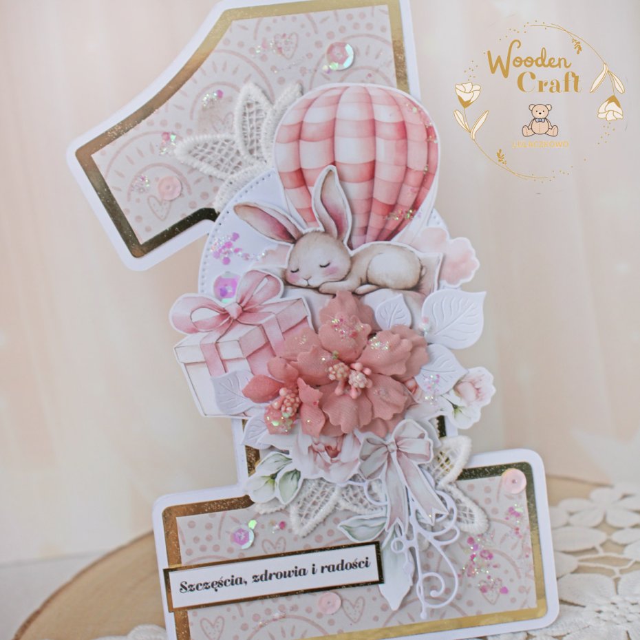 Urocza i nietuzinkowa, dziecięca kartka na roczek, w kształcie cyferki jedynki, wykonana z mixu kolekcji papierów dziecięcych, utrzymana w odcieniach brudnego różu, beżu i bieli z dodatkiem błyszczących, złotych akcentów. Kartka wykonana ręcznie z dbałością o każdy szczegół. Na środku znajduje się grafika uroczego, śpiącego króliczka, ozdobiona kompozycją kwiatową z ręcznie wykonanymi kwiatami, dodatkowo zdobiona cekinami i koronką, połyskującymi drobinkami, a także napisem "Szczęścia, zdrowia i radości" (na życzenie mogę dodać również imię dziecka, lub całkowicie zmienić napis na inny).