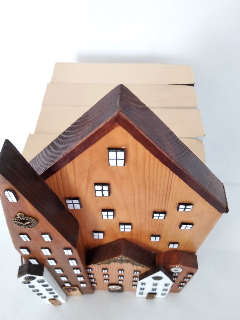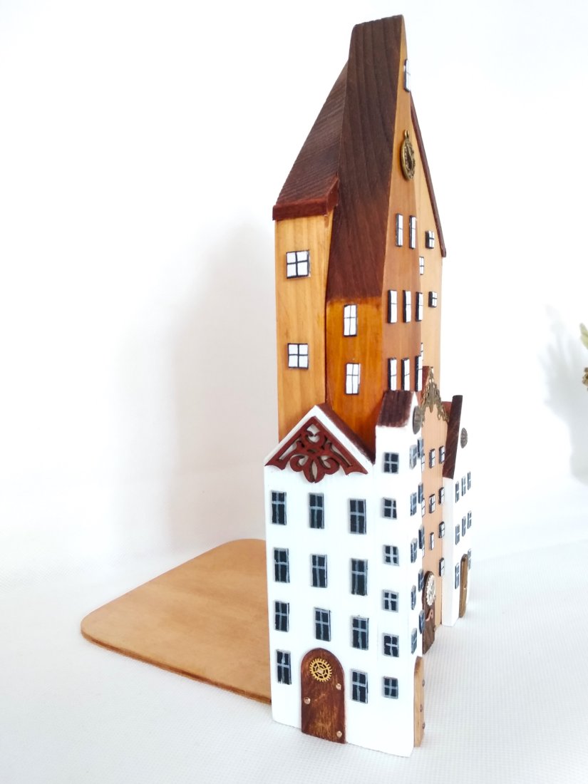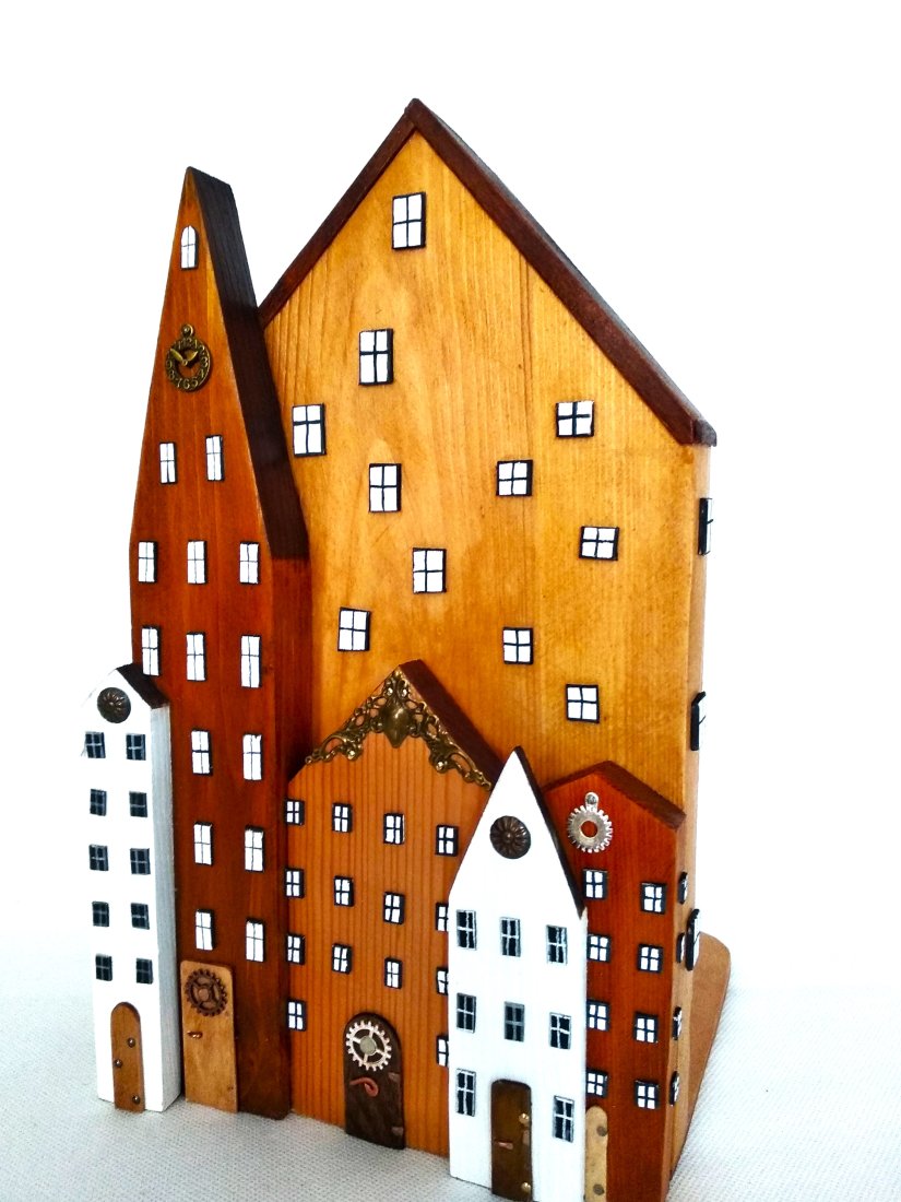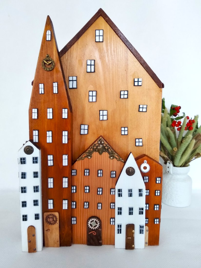 Misternie wykonane drewniane budynki układają się w malowniczy pejzaż, niczym fragment urokliwej, zabytkowej uliczki. Różne odcienie drewna podkreślają naturalne piękno materiału, a ręcznie malowane detale – maleńkie okienka, drzwi i zegar na wieży – dodają jej wyjątkowego, nieco magicznego charakteru.