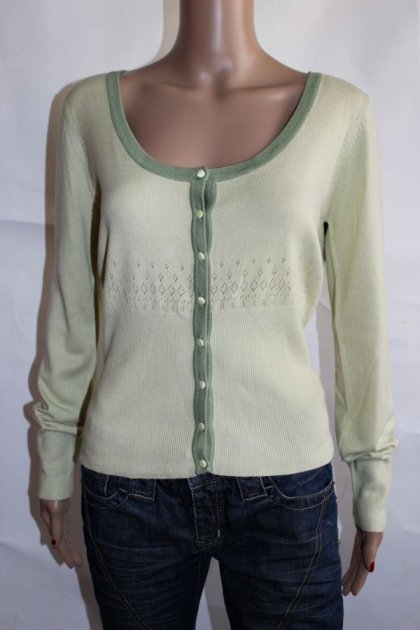 Sweter New Look w rozmiarze40 Odcienie zieleni. Z przodu efektowne wstawki. Zapinany na guziki. Z przodu również delikatny ażurowy wzór. Materiał 70% viskoza, 30% nylon. Stan bardzo dobry