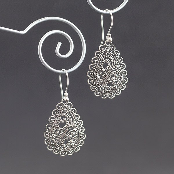 Misternie utkane ze srebra, ażurowe kolczyki wielkości 25x18mm. Długość kolczyków z biglem 4 cm. Kolczyki są ozdobnie zapakowane.