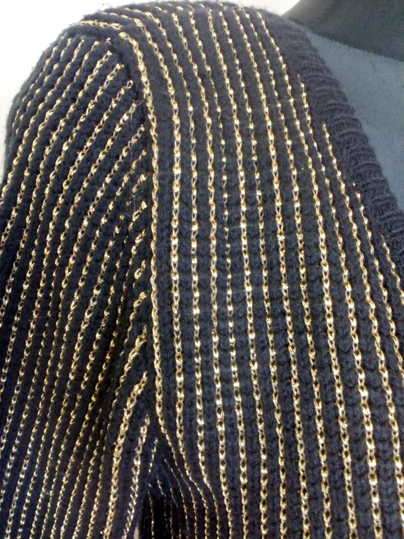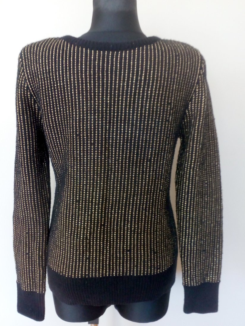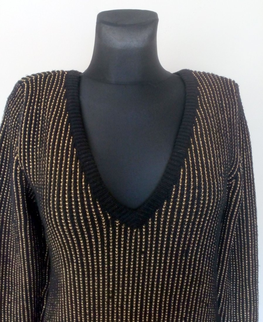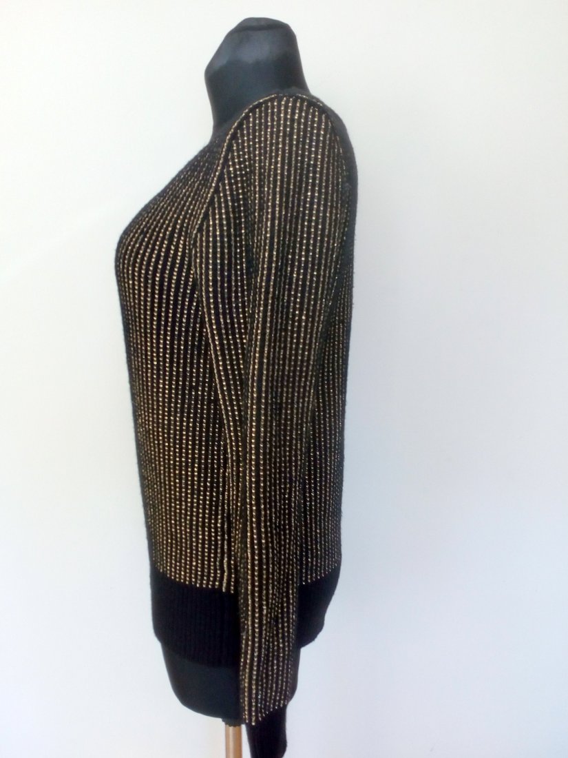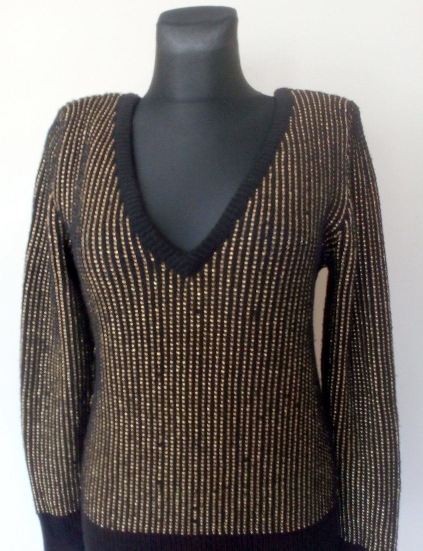Elegancki czarny sweter z metaliczną nicią w złotym kolorze, z ładnym dekoltem w szpic, na ramionach poduszki