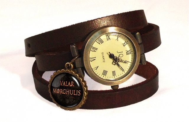Zegarek ze skórzanym paskiem kilkakrotnie zakręcanym na ręku z ręcznie robioną zawieszką (kaboszonem).