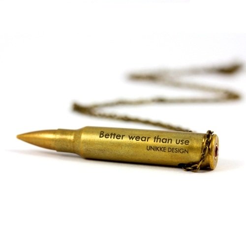 Efektowny wisior wykonany z prawdziwego naboju. Na szczycie łuski ręcznie oprawiona rubinowa cyrkonia Swarovskiego 3mm, z boku wygrawerowany tytuł kolekcji Better Wear Than Use oraz marka Unikke Design. Wisior zawieszony na mosiężnym łańcuszku długości około 70cm. Wisior idealny dla pewnych siebie i odważnych osób. Przy zamówieniu specjalnym możliwość wyboru koloru cyrkonii. Możliwość dodania własnego graweru w cenie zamówienia ( długość dowolna, grawer umieszczony jest po drugiej stronie napisu firmowego). Przy własnym grawerze czas wysyłki może się wydłużyć do 4 dni.