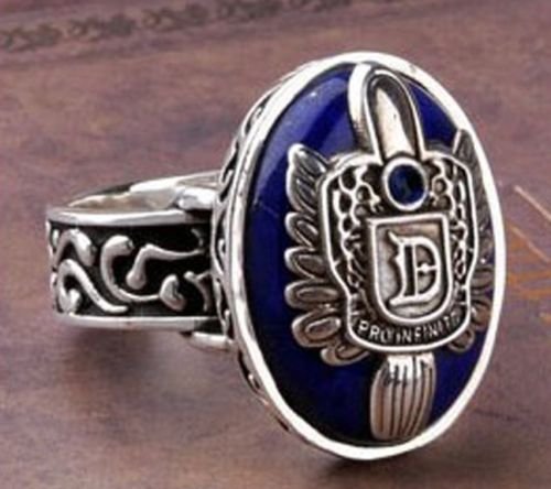 Pierścień dla fanów serialu Pamiętniki Wampirów. Wykonany z grubego metalu w kolorze srebrnym, z szafirowym oczkiem na którym umieszczono logo.