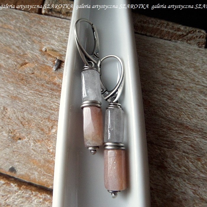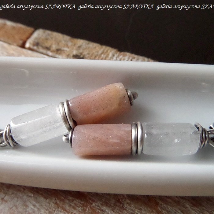 Smukłe kolczyki wykonane z kryształu górskiego i kamienia słonecznego w postaci ciosanych, lekko nieregularnych walców wielkości ok. 11 x 6 mm i oksydowanego srebra pr. 925. Długość - 4,6 cm