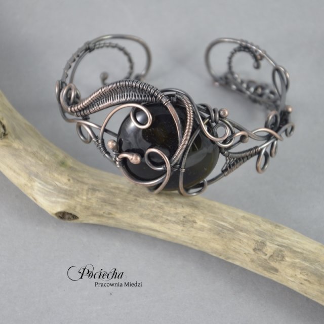 Piękna bransoleta stworzona od podstaw ręcznie z miedzi. Centrum bransolety stanowi duży czarny szklany kaboszon.