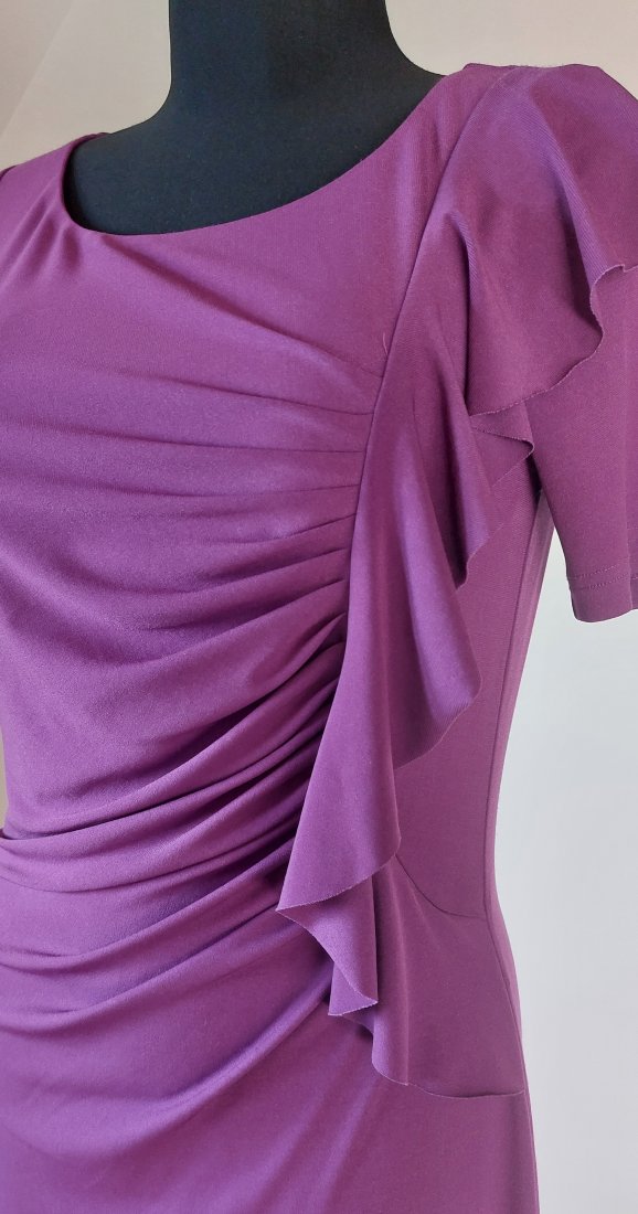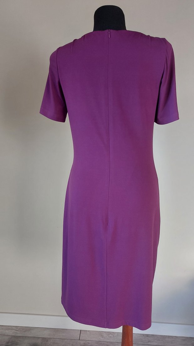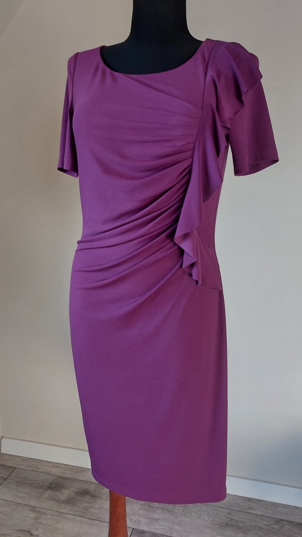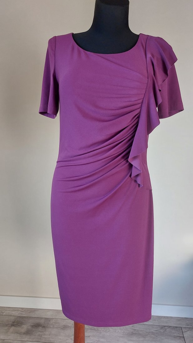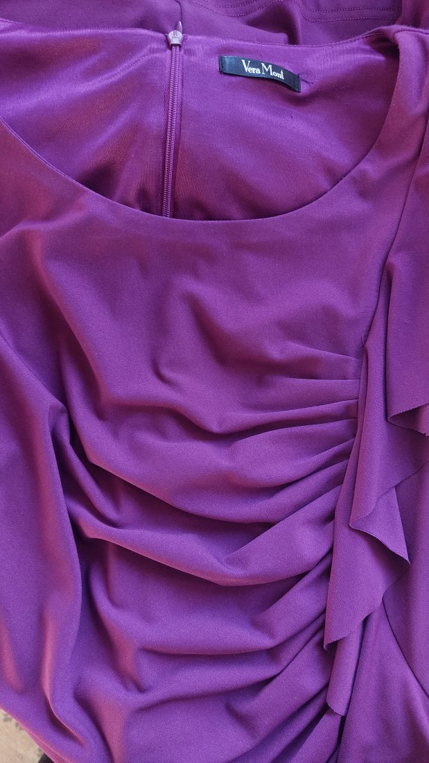 Fioletowa sukienka marki Vera Mont zachowana w bardzo dobrym stanie. Fason podkreślający sylwetkę, długość midi, z przodu marszczenia i falbana. Podszewka po przeróbkach krawieckich. Sukienka wykonana z elastycznego materiału, dobra jakość. Sugerowany rozmiar S.