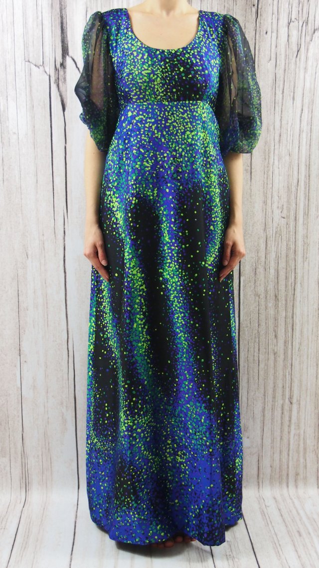 Oryginalna sukienka z lat 70-tych. Marki Vera Mont Paris. Materiał: miły w dotyku (prawdopodobnie poliester, podszewka z nylonu). Rękawy bufki, transparentne.