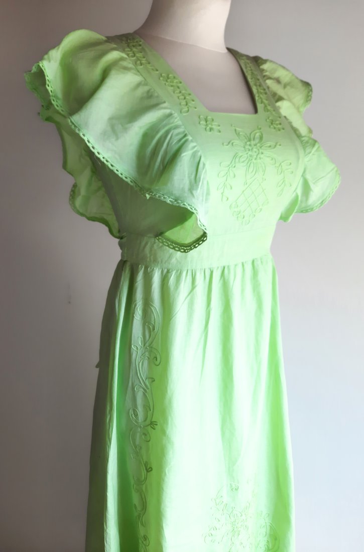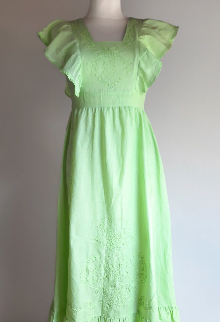 piękna letnia długa sukienka vintage z lat 70-tych w kolorze bladej limonkowej zieleni, bez rękawów, wokół ramion piękne duże falbanki, z przodu haft z motywem kwiatowym, sukienka w pasie odcinana, dół również haftowany i zakończony falbanką, na plecach sukienka zapinana na suwak, w pasie wiązana, na podszewce, brak metki z rozmiarem i składem