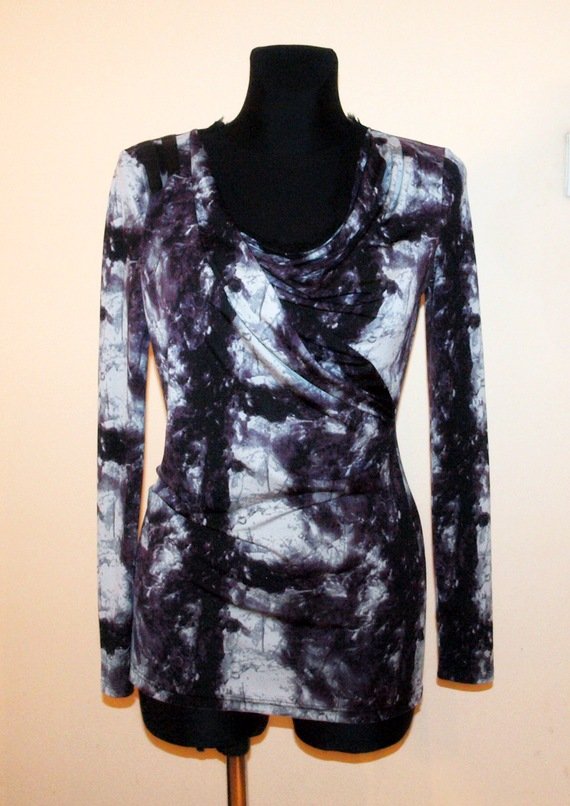Piękna Tunika marki Simply Vera by Vera Wang, . Materiał 96% poliester, 4% spandex. Śliczne drapowania, wykończenie dekoltu ekoskórką i prześwitującym, czarnym materiałem.. Stan bardzo dobry, prawdopodobnie nieużywana. Rozmiar z metki XS, ale na 36 bezie pasować. Na manekinie o rozmiarze 38.