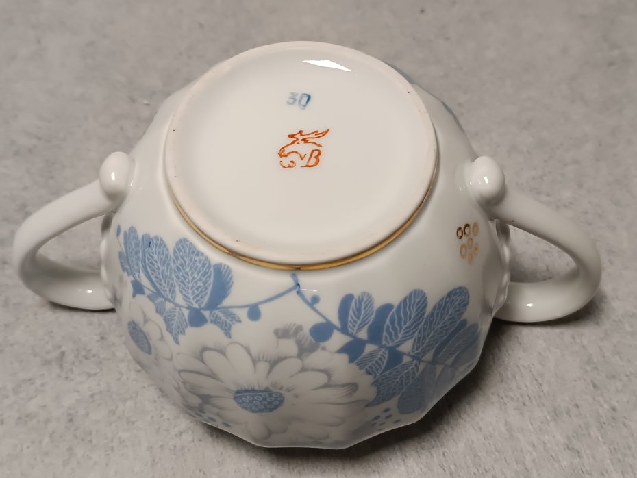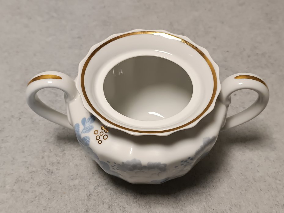 Jest to dekor w kolorze kobaltowo-niebieskim i 22-karatow złocenie na białym tle przy krawędziach elementów.