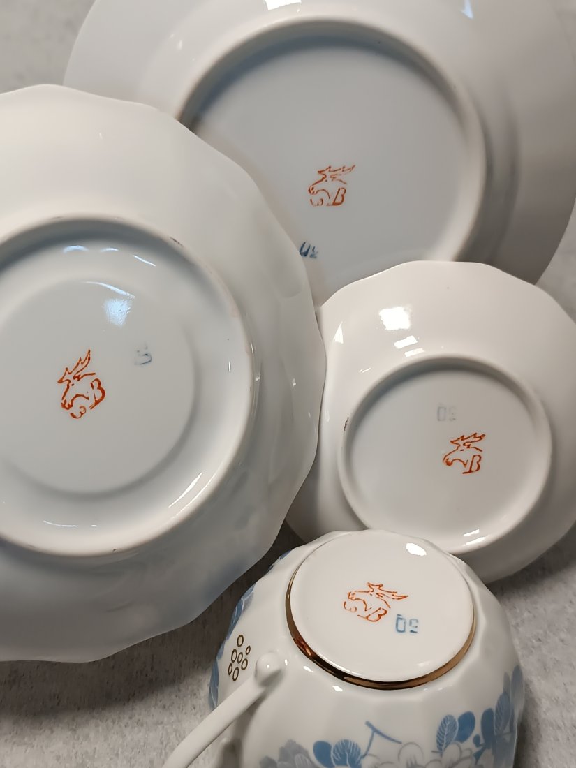 Jest to dekor w kolorze kobaltowo-niebieskim i 22-karatow złocenie na białym tle przy krawędziach każdego z elementów.