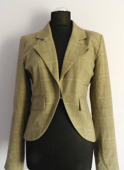 Wzór drobnej kratki, kolory; odcienie jasnego brazu, granat, ecru,stan bdb