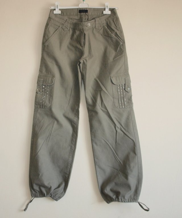 Spodnie marki Vero Moda w rozmiarze 38. Kieszenie ozdobione koralikami, dół nogawki ze sznurkiem do ściągania. Materiał 100% grubsza bawełna w kolorze oliwkowym. Prawdopodobnie nieużywane, wada-brak kilku koralików. Podaję wymiary mierzone na płasko;