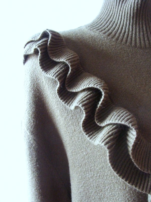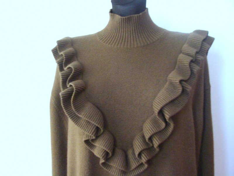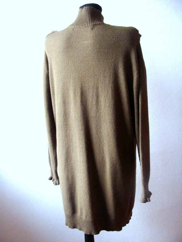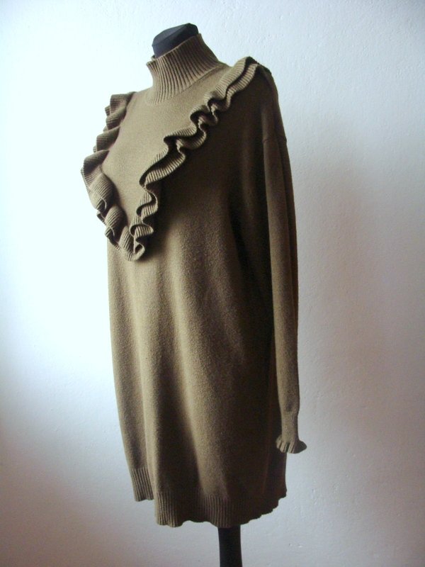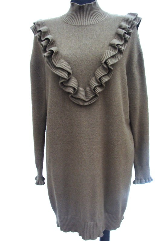 Dzianinowa sukienka z wiskozy z dodatkiem poliestru i nylony w kolorze zgniłej zieleni ( na zdjęciu wyszedł kolor khaki). Minimalistyczny , prosty krój z półgolfem z z podwójną falbanką z przodu. Wciągana - bez zamka. Wykończona ściągaczami, przy mankietach z falbanką . Miła podatna i rozciagliwa